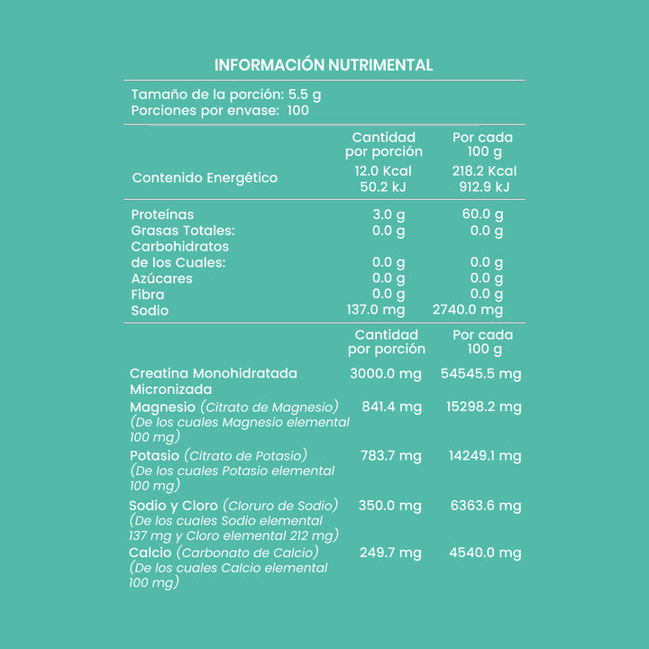 Nuestra fórmula combina creatina pura con electrolitos esenciales (sodio, potasio, magnesio y calcio) para brindar energía sostenida, fuerza y una hidratación óptima.